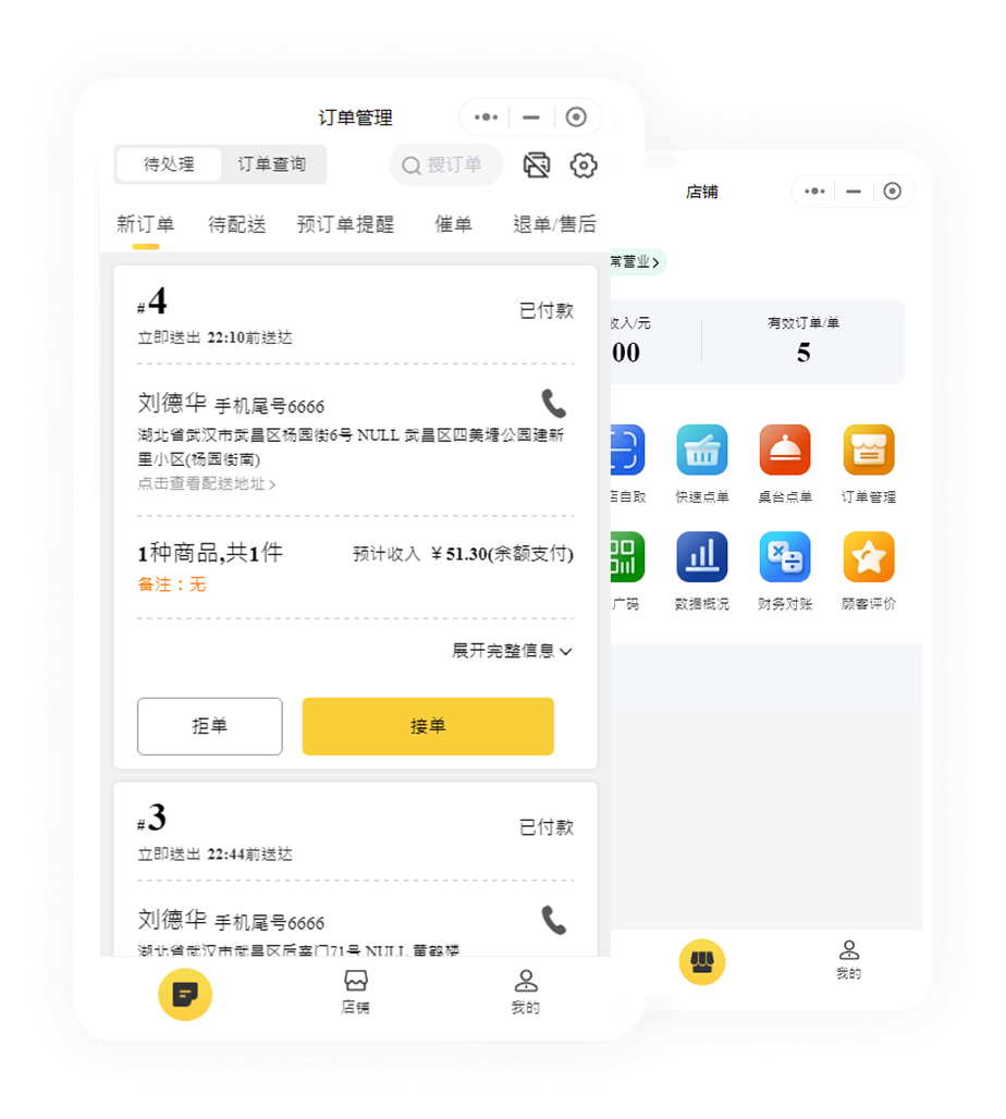 使用移動端即可管理店鋪,上架商品,查看商家信息營業狀態等。 店員可通過APP和PC端消息提醒,快速接單,避免商家漏單