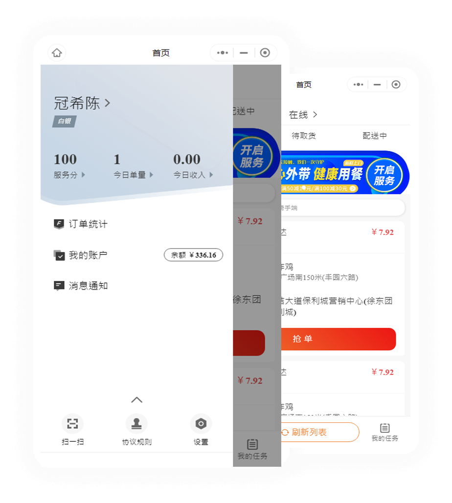騎手通過app可快速搶單,掌握訂單配送及收益情況,同時支持在線提現申請等功能